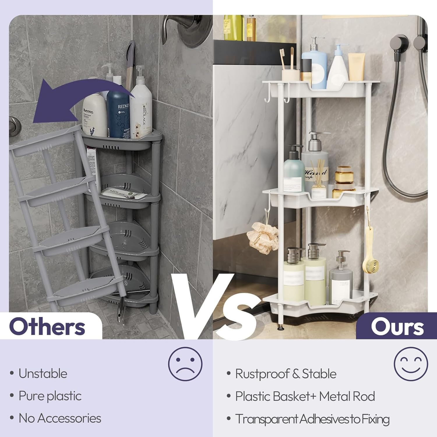- [Qualitative Materials]: Our waterproof shower caddy stand is made of high-quality, combines stainless steel support poles with plastic baskets to ensure longevity & durability. The premium construction of shower organizer corner can prevent rust, moisture and water